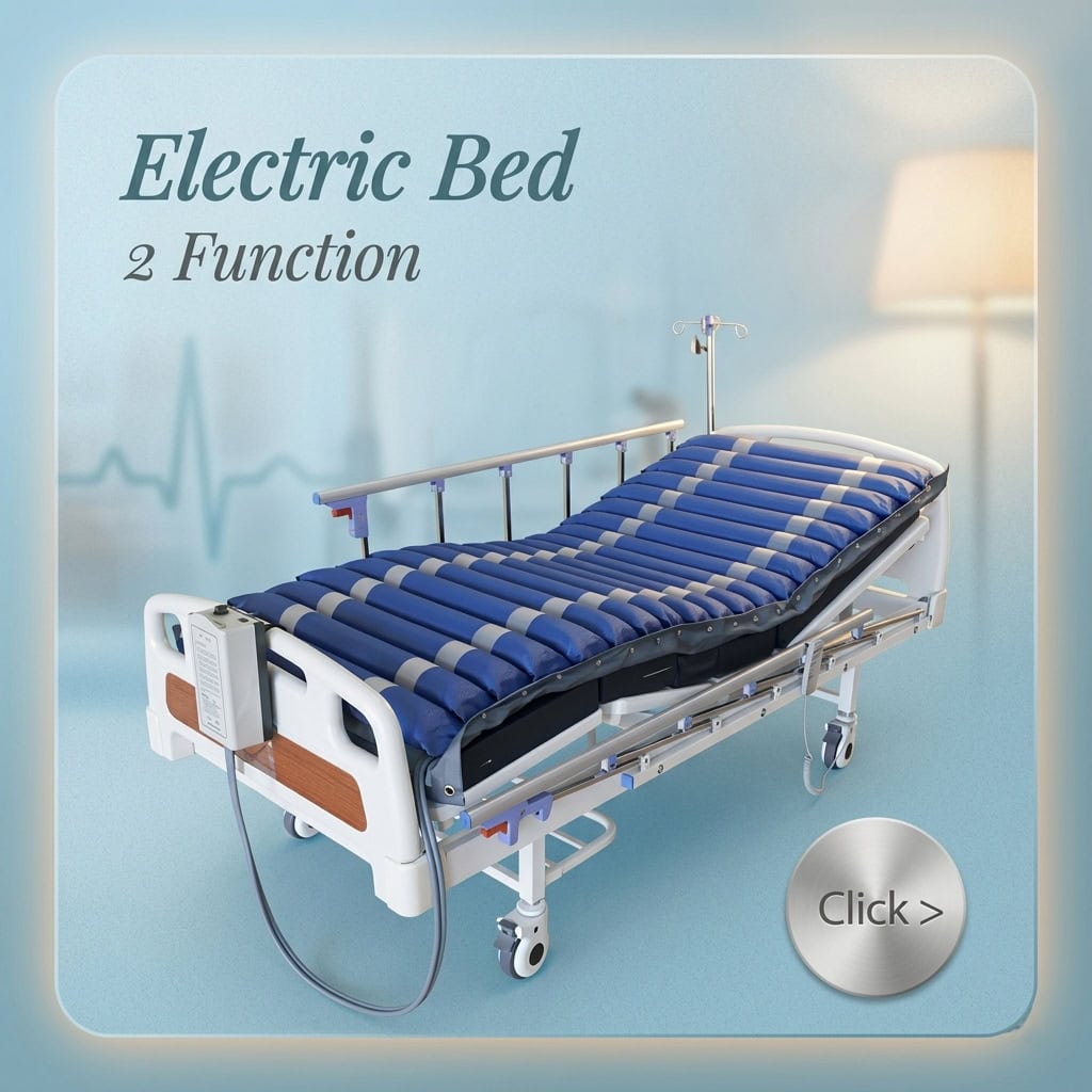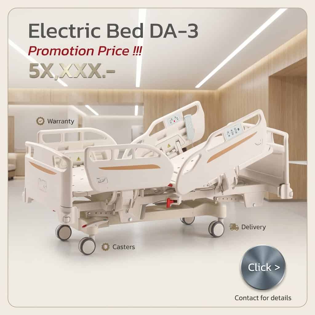 - เตียงผู้ป่วยไฟฟ้า มีทั้งแบบควบคุมด้วยการใช้มือหมุนและระบบไฟฟ้า สามารถปรับได้หลายระดับ มีระบบล็อกล้อเพื่อความปลอดภัย ช่วยลดภาระในการเคลื่อนย้าย รวมถึงปรับท่าทางของผู้ป่วย เพิ่มความสะดวกให้แก่ผู้ดูแล